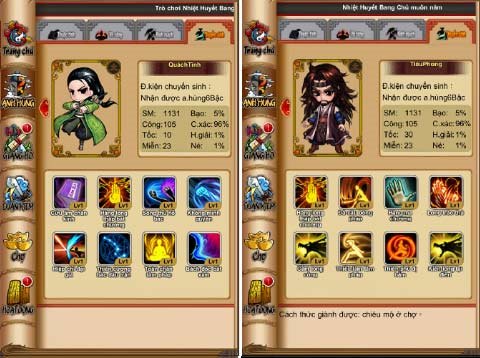 - Chiêu Mộ Anh Hùng: chiêu mộ 50 nhân vật nổi bật với các chiêu thức và sức mạnh khác nhau chia làm 5 cấp là: trắng, lục. lam, tím, vàng